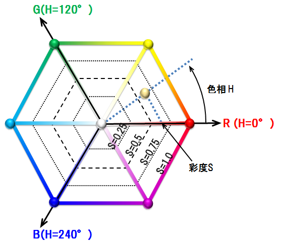 ・「HSL水平断面図である正六角形」を「0°~360°範囲の値を環状に並べることが可能な正円」へ変形