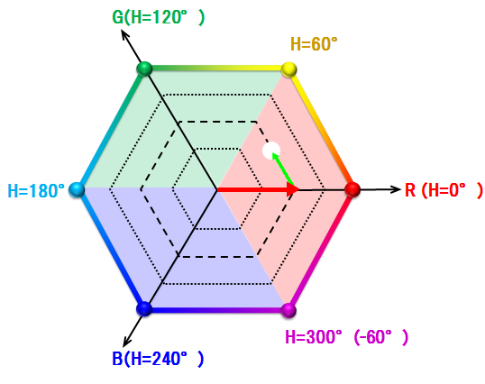 「HSL水平断面図である正六角形」をRGB各成分の大小関係で6エリアへ分類
